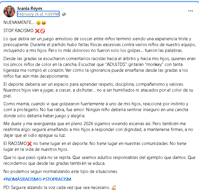 Durante el relato compartido en sus redes sociales, Ivania Reyes detalló que sus hijos eran los únicos niños afrodescendientes en el terreno de juego. “Escuchar que adultos gritaran ‘monkey’ (mono) con tanta ligereza me rompió el corazón”, expresó la madre, subrayando la decepción de ver cómo el odio y la ignorancia se transmiten a las nuevas generaciones desde las gradas. El incidente escaló cuando uno de los pequeños recibió una fuerte agresión física, lo que obligó a Reyes a intervenir instintivamente para proteger a su hijo en un espacio que debería promover valores como la disciplina y el compañerismo.
