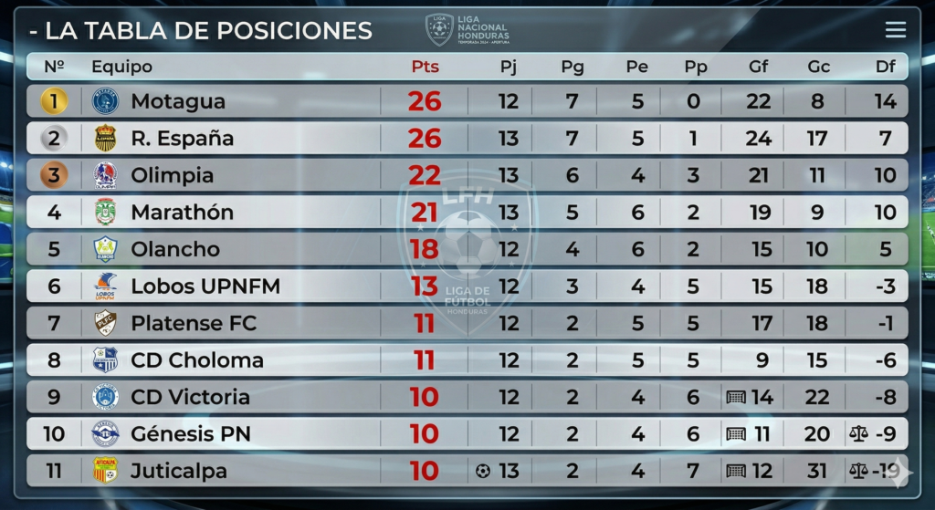 Actualmente, el liderato es compartido por Motagua y Real España, ambos con 26 unidades tras empatar en el clásico disputado en esta jornada.